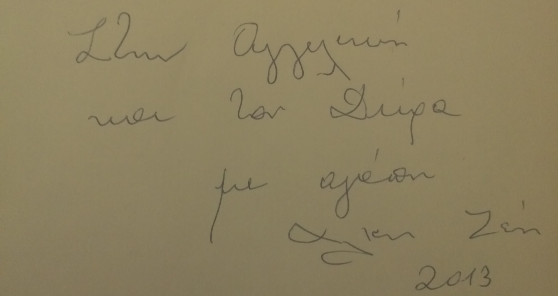 Ξανά λοιπόν στο πατρικό μου. Παίρνω το βιβλίο και κάποια στιγμή λίγο πριν φάμε την πλησίασα και της ζήτησα να μου το υπογράψει.